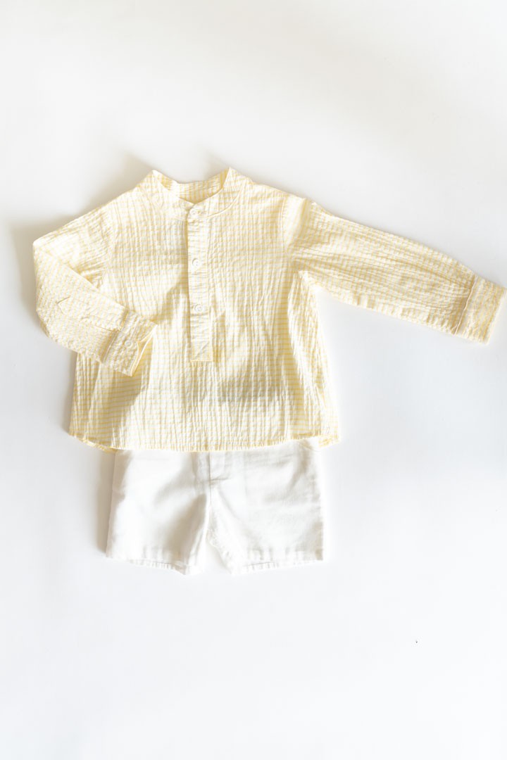 set short blanco y camisa rayas amarillas