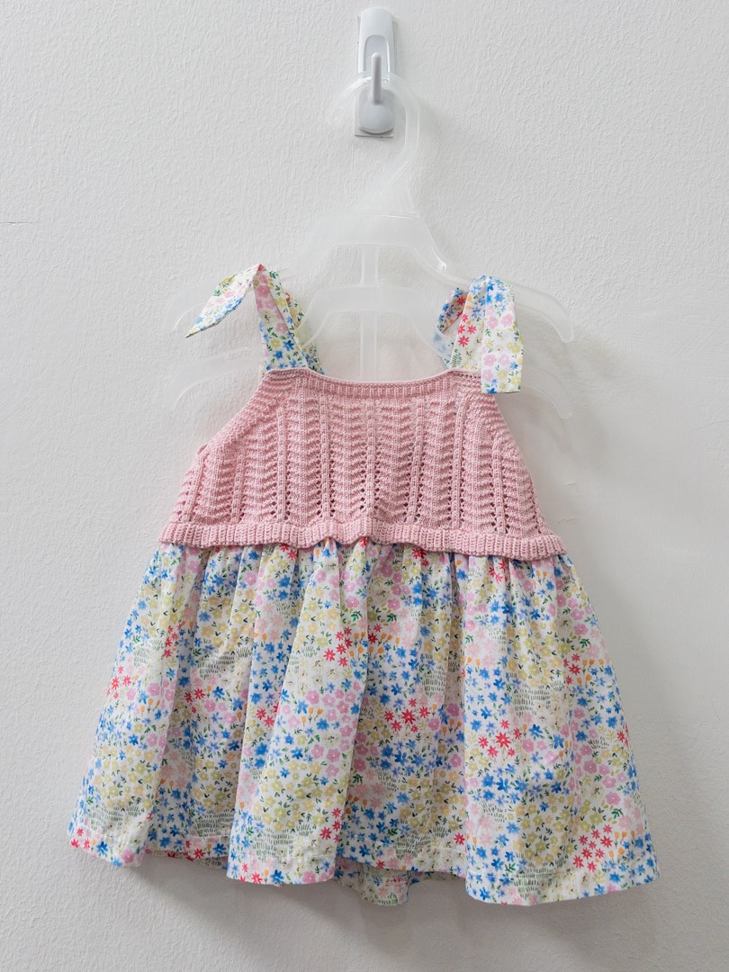 vestido florcitas azules y rosadas, pecho bordado rosado