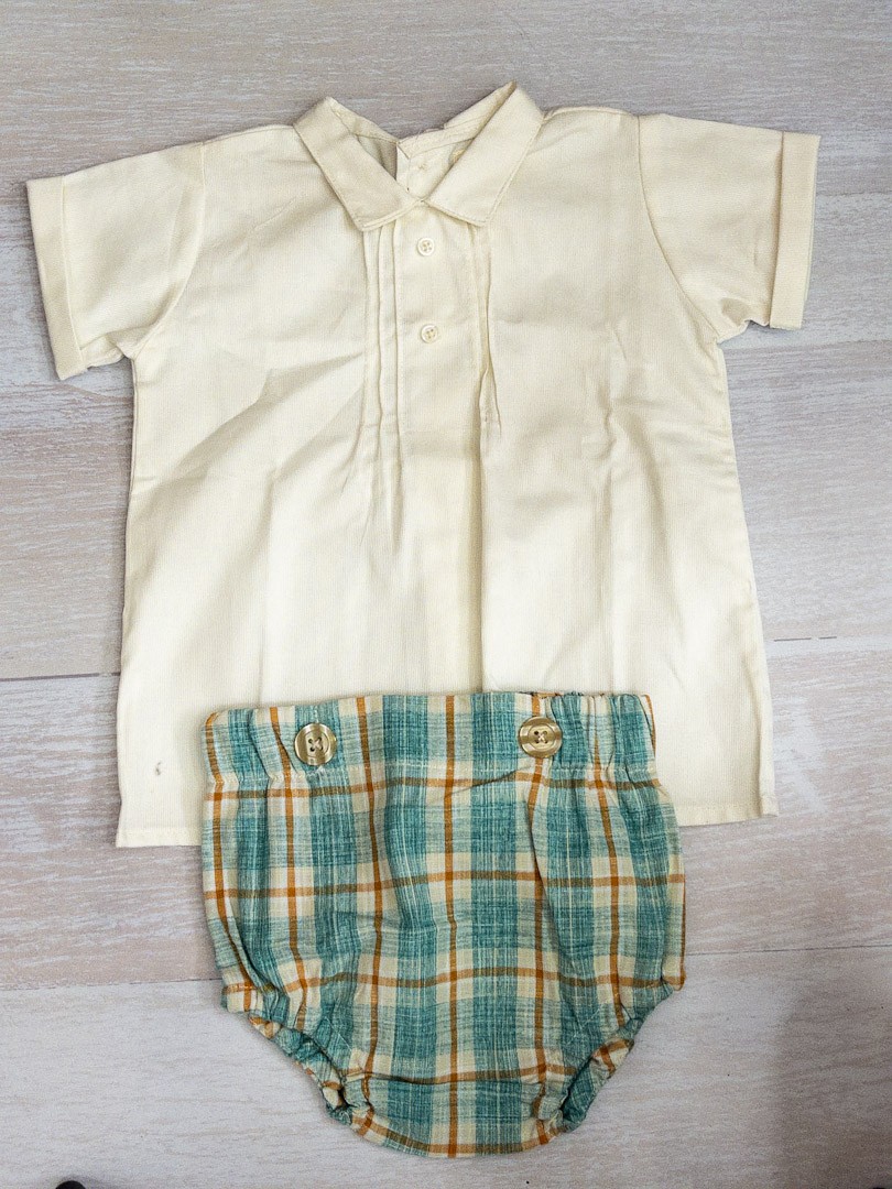 camisa lino con cubre panal de cuadros mostaza y celeste