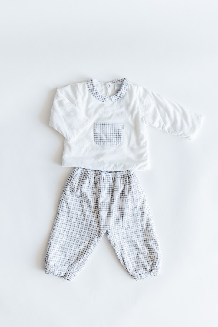set pantalon blanco cuadros cafes y azul camiseta manga larga