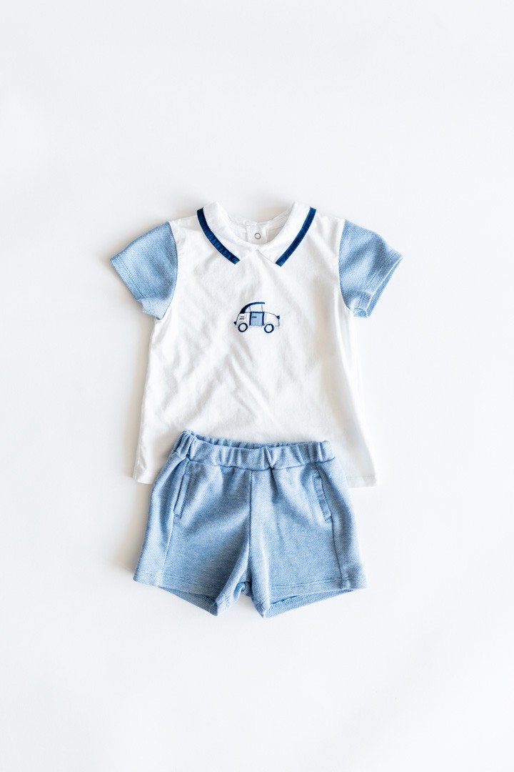 set short puntos azules y camiseta carrito algodon