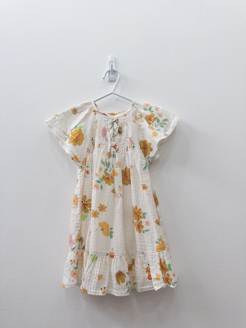 vestido beige con flores mostazas y rosadas
