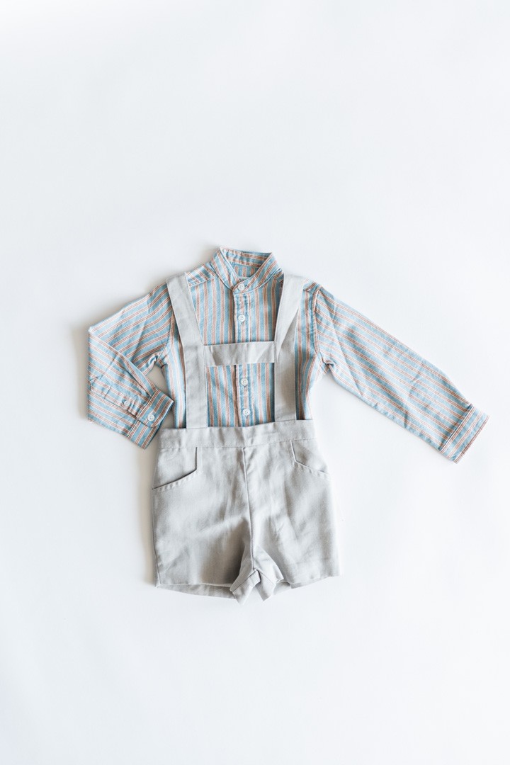 camisa azul rayas naranjas y short gris