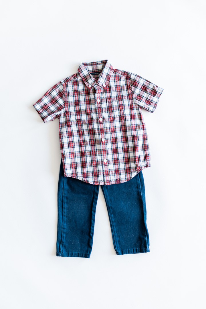 set pantalon largo azul y camisa manga corta cuadros rojos con blancos