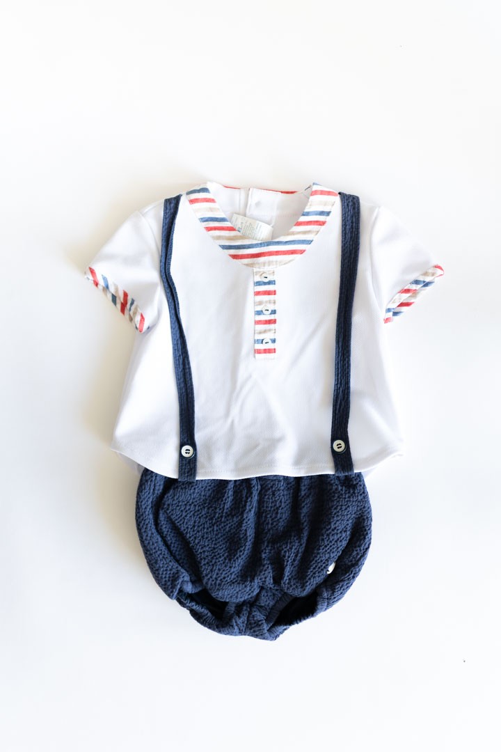 set camisa blanca con cuello de rayas azul rojo y beige con tirantes y short azul