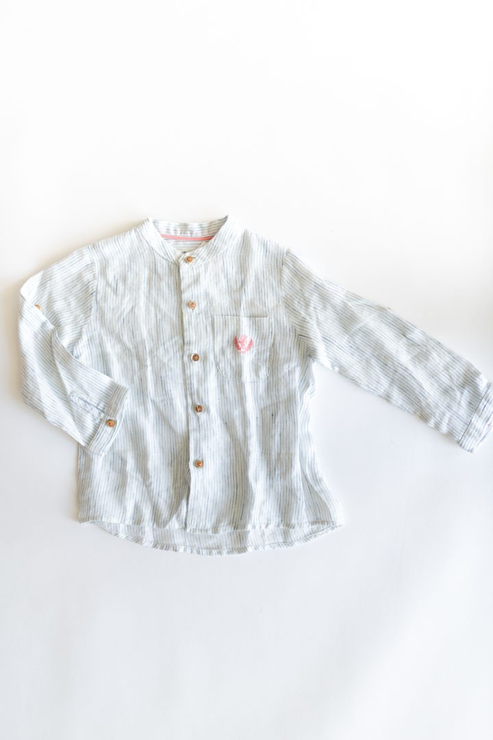 camisa blanca rayas azules y logo rosado