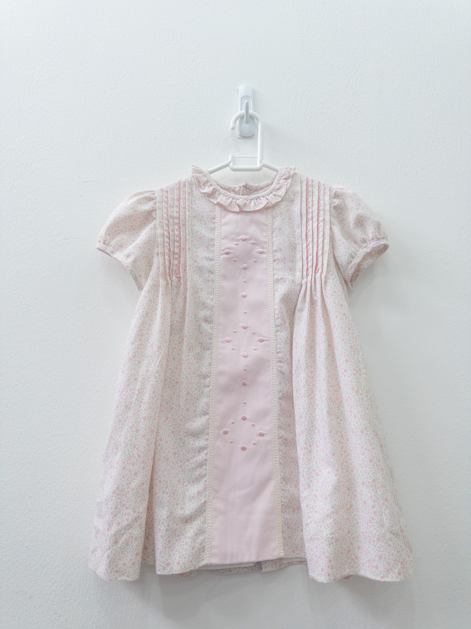 vestido blanco con flores rosadas y detalles de bolas rosadas