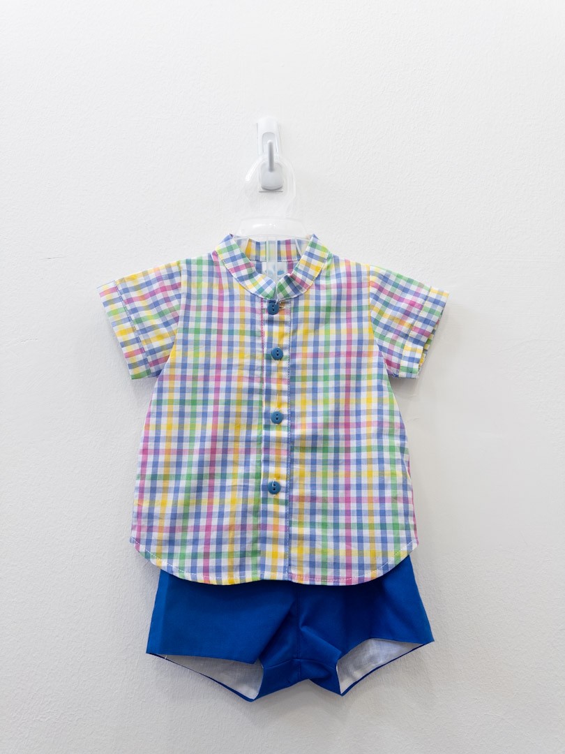 set short azul camisa cuadros azules, verdes, amarillos, verdes