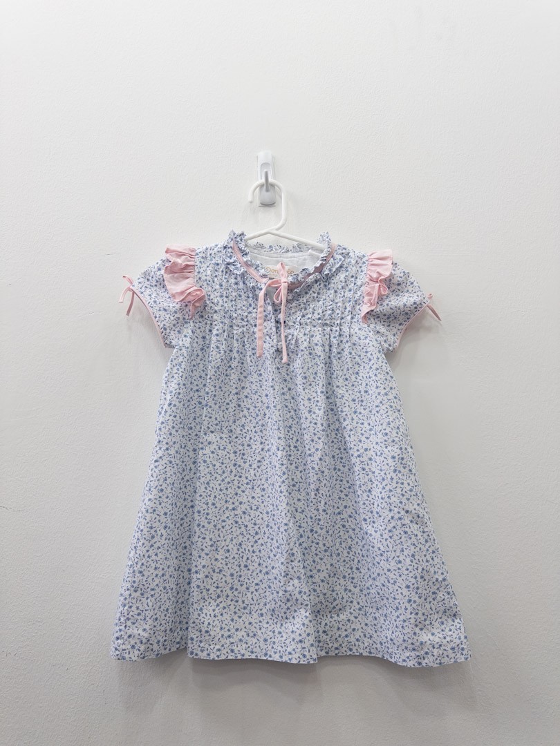 vestido blanco con flores azules y cuello rosado