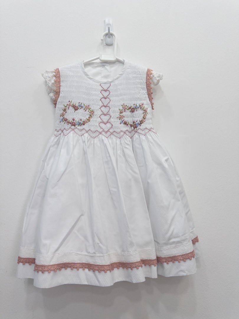 vestido blanco con detalle de nido de abeja con flores rosadas celestes