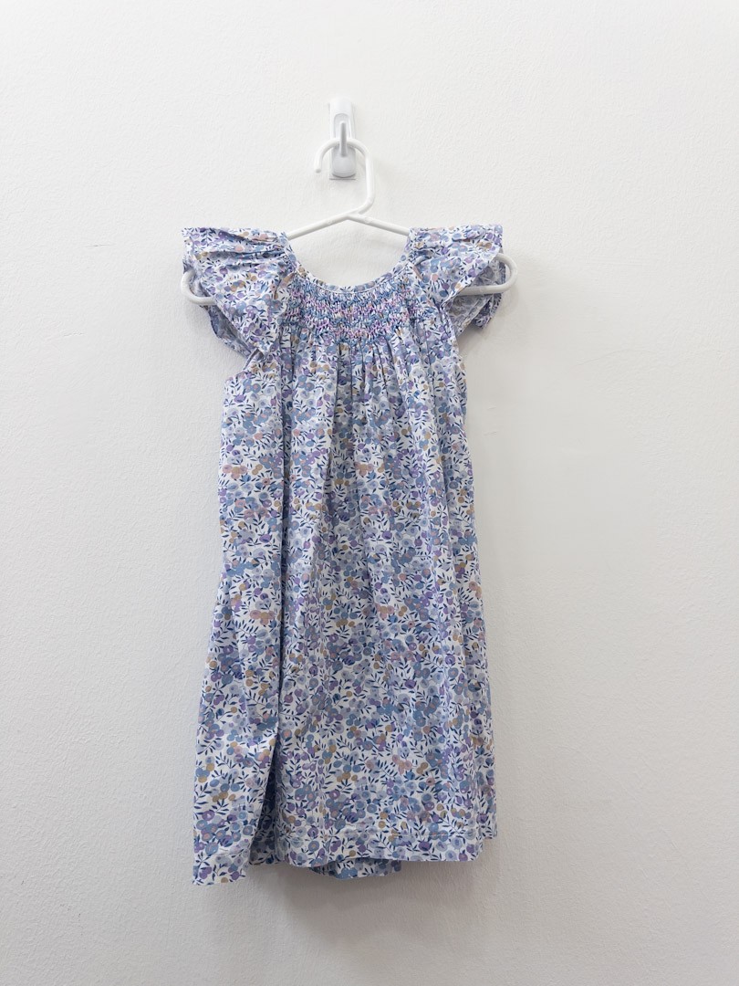 vestido blanco con flores lilas y grises, punto en pecho