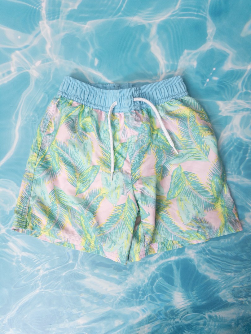 pantalon de baño rosado y palmeras turquesas