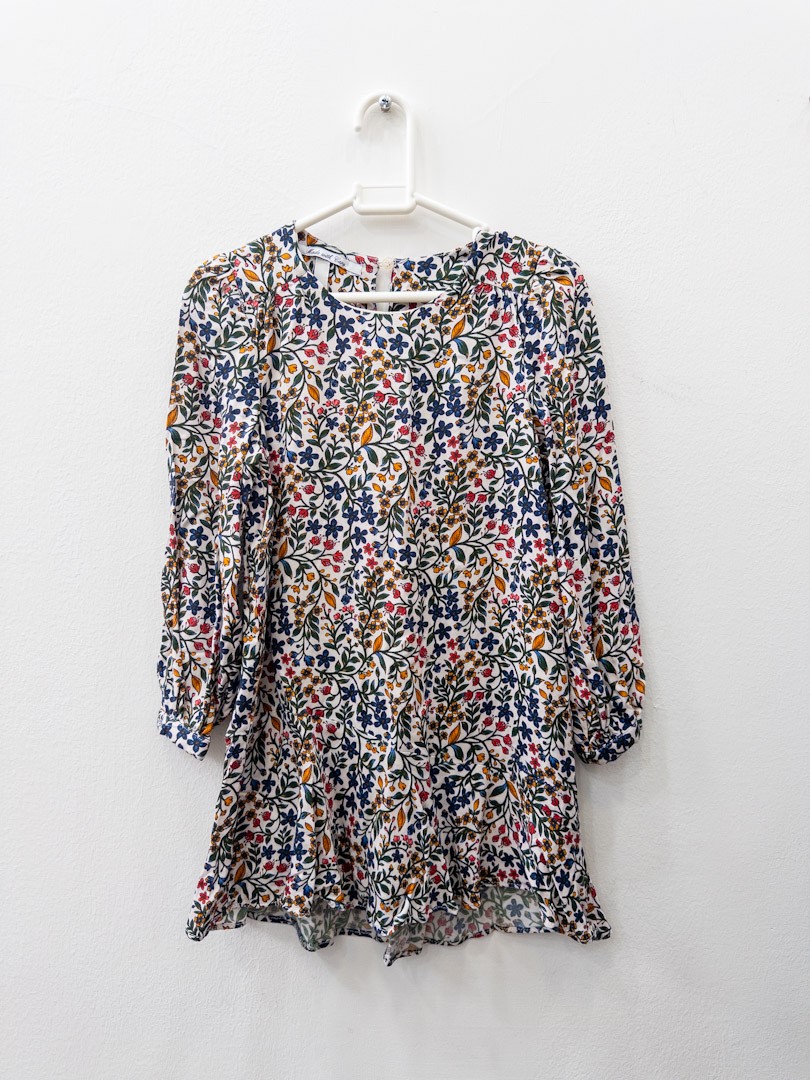 vestido beige flores azul oscuro mostaza y rosa