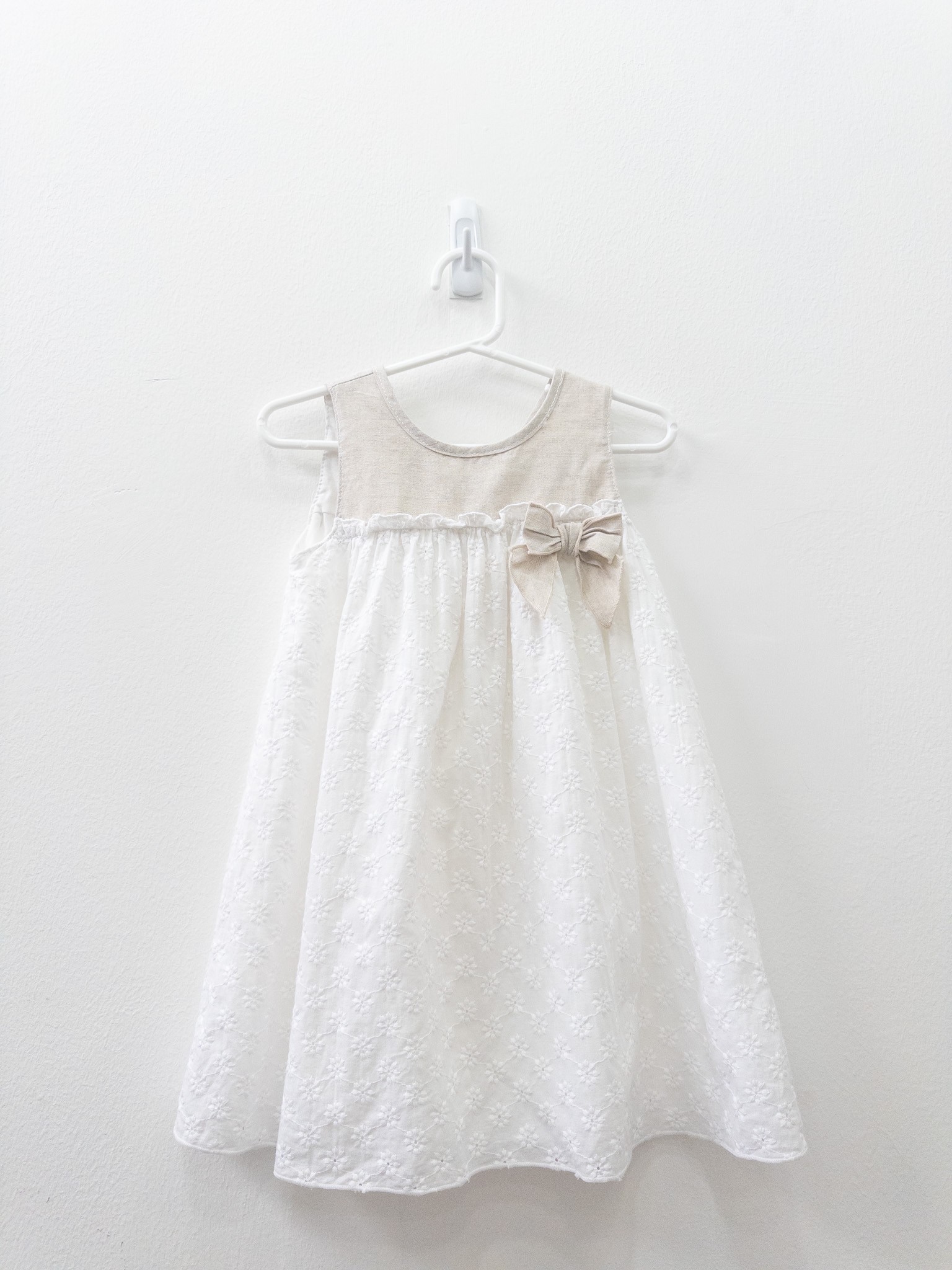 vestido blanco con flores y top beige lino
