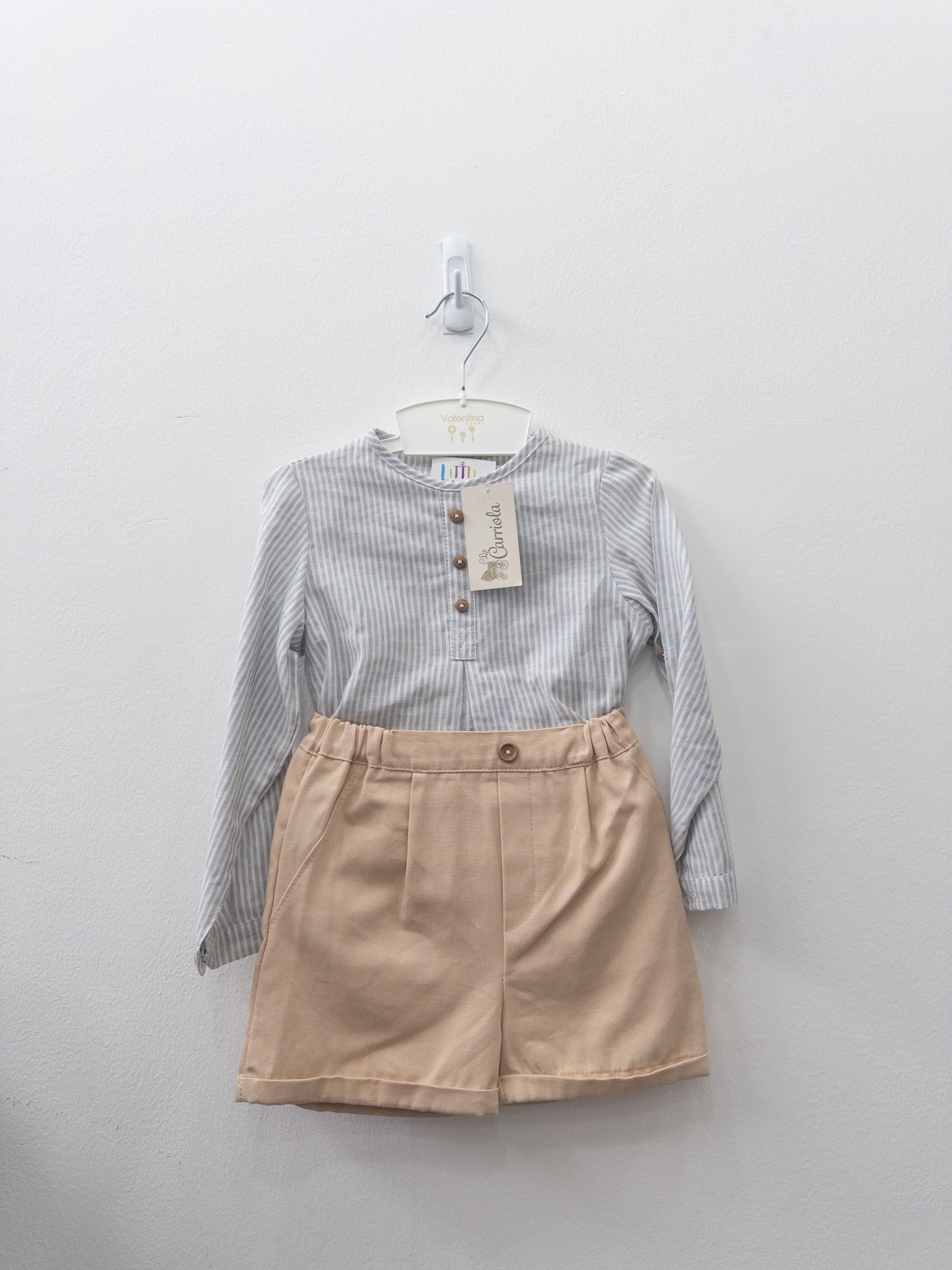 set short beige y camisa rayas azules