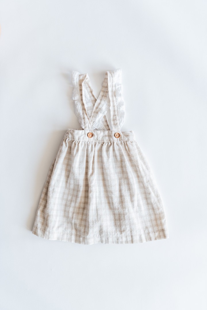vestido cuadros beige y blancos con vuelos en espalda