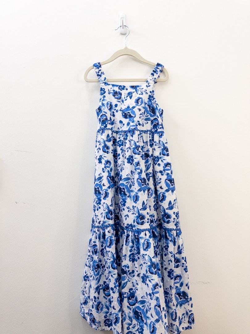 vestido largo azul con blanco