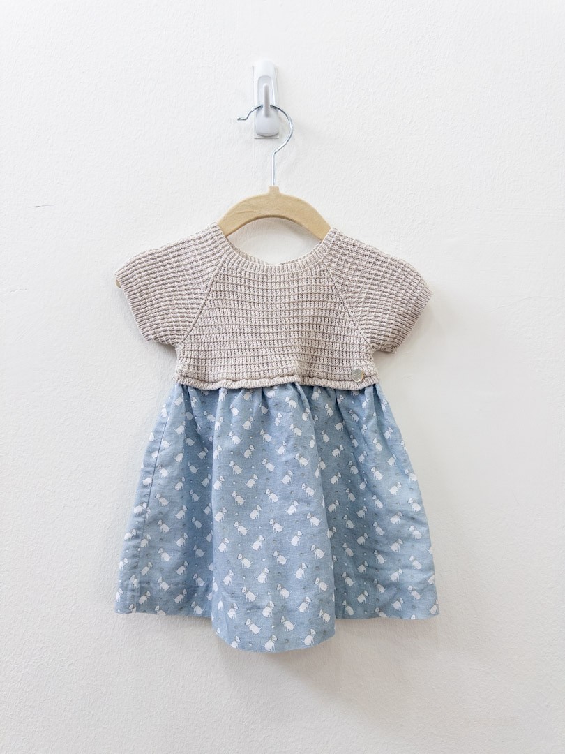 vestido pecho beige falda celeste con perros