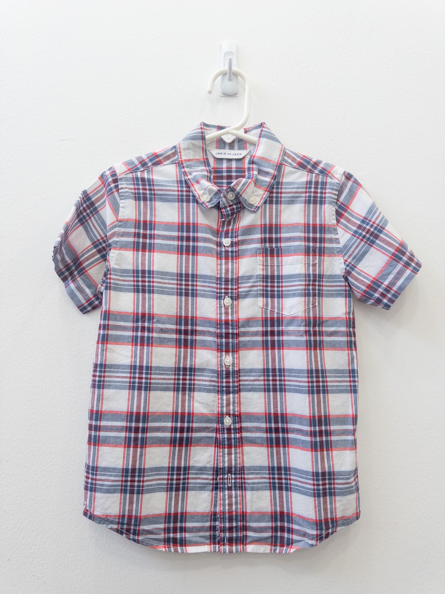camisa blanca con rayas azules y rojas