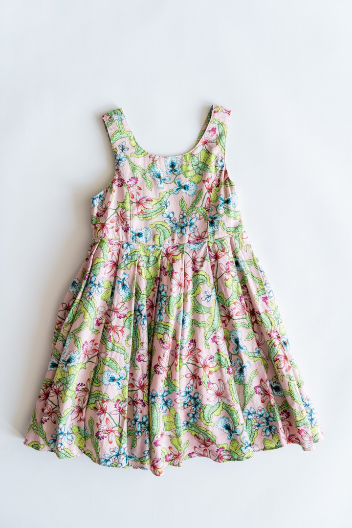 vestido rosado con hojas verdes y azul y fucsia