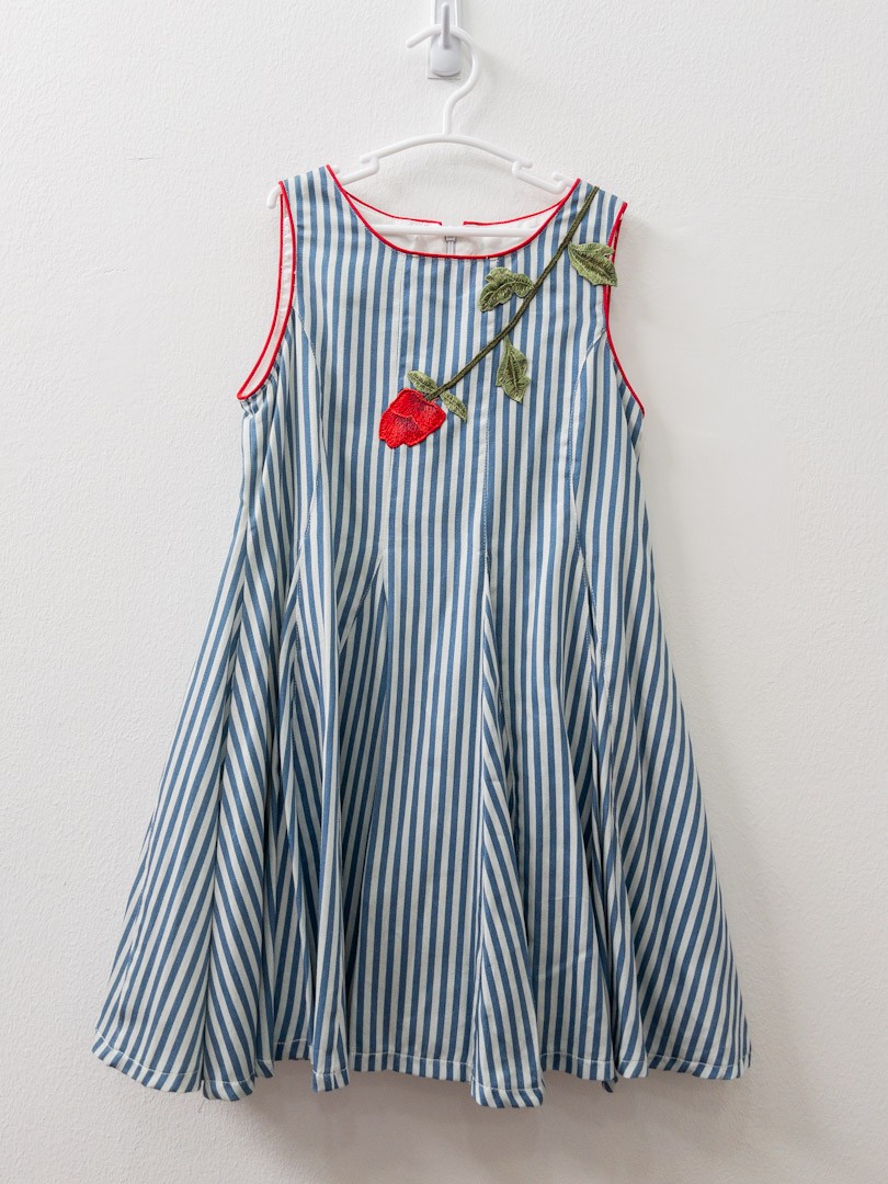 vestido rayas celestes con rosa bordada
