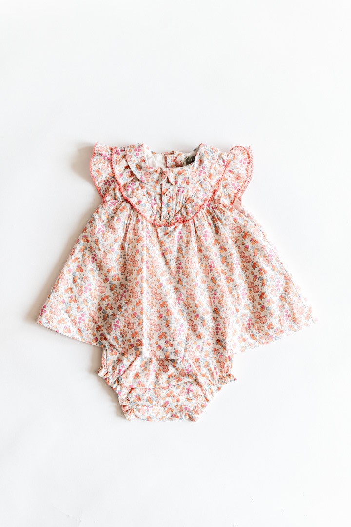 vestido beige con flores rosadas, naranjas y fucsias